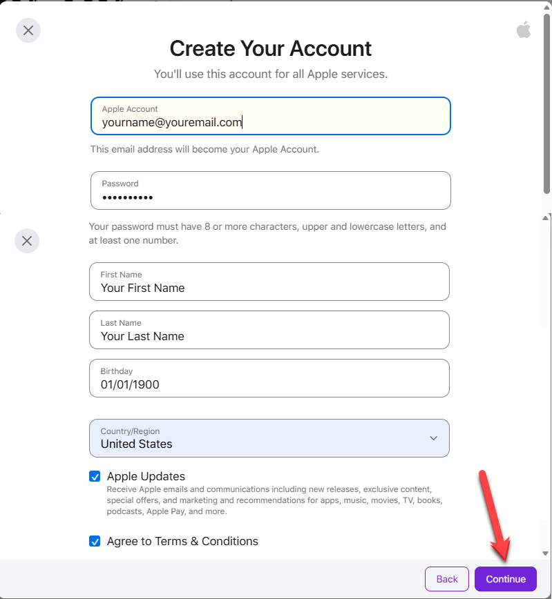 - Create a Password, add your first name, last name, birthday, select your Country and agree to the terms